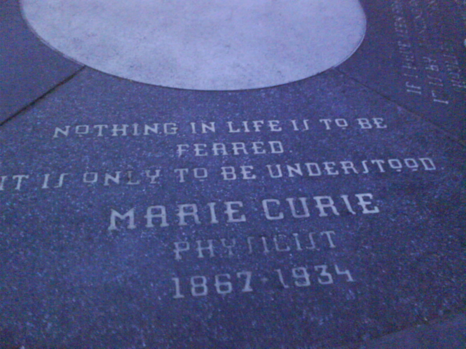 This quote, and others, are part of a plaza celebrating scientific progress. I was pleased to see Curie represented, and her quote made me think.  I think there are things that should be feared — and that fear can prevent understanding.  Then there’s how her lifespan was impacted by her work…