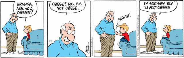 You may have seen today’s Pickles. Transcript: Panel 1: Nelson asks Earl: Grampa, are you obese? Panel 2: Earl: Obese? No, I’m NOT obese. Panel 3: Nelson: [pokes tummy, with a “squish” noise] Panel 4:  Earl: I’m squishy, but I’m NOT obese. This illustrates much of the “obesity” discussion. Earl knows he’s fat.  Earl assumes […]