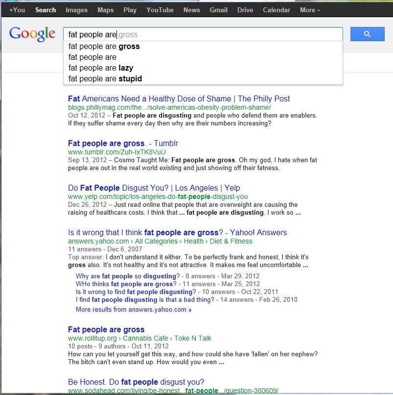 Yeah, I get those results too. The last one on my short list of suggestions was “fat people are gross tubmlr” Good to know there’s a whole tumblr for how gross I am! Time to party!