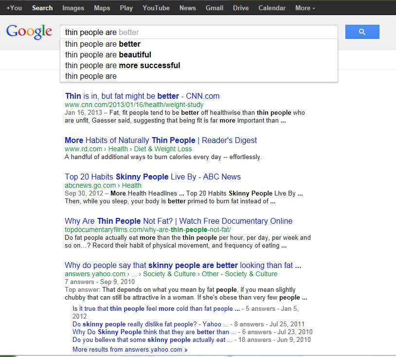 Typing in “thin people are” shows options like “better”, “beautiful”, and “more successful”.  The top piece discusses the latest “moderately fat people live longer” study.**